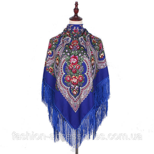 Хустка українська народна в квітковий орнамент з бахромою красивий колір синій 110*110