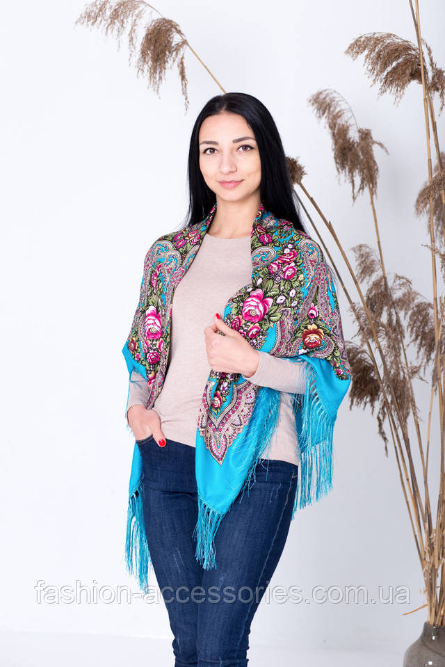 Традиційний квітковий орнамент з яскраво вираженою народністю користується величезною популярністю. Правильно підібраний колір косинки перетворить Вас в стильну дівчину. Володарка даного аксесуара обов'язково виділиться з натовпу привабливим чином яке залишиться в пам'яті надовго. Розмір косинки достатній щоб носити його на плечах прикрившись від холоду чи пов'язати на голову. Матеріал добре зберігає тепло в морозну погоду. Обробка бахромою додає хустині елегантності.